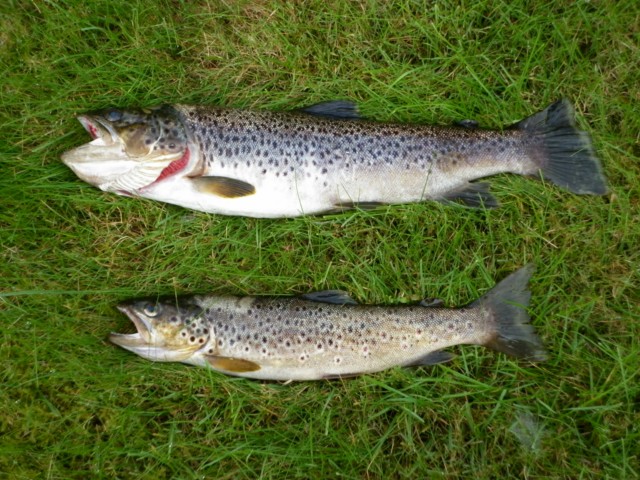 Truites ; en rivière c'est le calme plat. En lac c'est variable. Témoins, les deux belles farios capturées par un adhérent de SIZUN (voir photo)